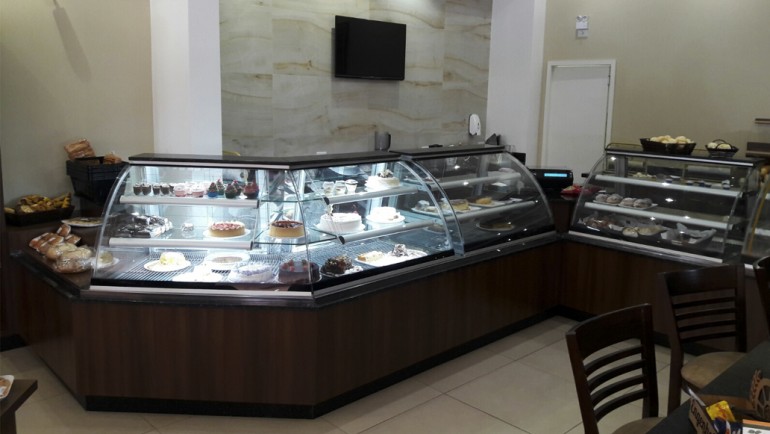 Balcão atendimento, Separador de ambientes, revestimento de colunas, Expositor para bolo vertical, Geladeira vertical 5 portas.