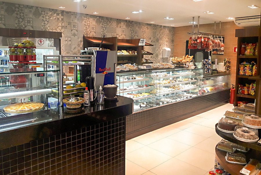 Balcões de atendimento quadrado quente, frio e seco, salameiro em inox preso no teto, geladeira e móveis fundo padaria.